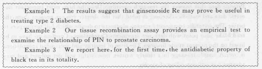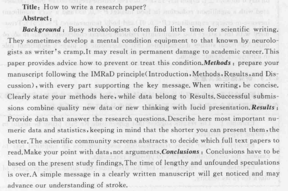 最后,笔者愿意推荐一篇典型的结构式英语摘要(Alexandrov,2004)供大家品味。这不仅是一篇典型的结构式的摘要,更重要的是在这篇摘要里,它告诉人们如何撰写研究论文(The title of the paper is“How to write aresearch paper”)。像其他结构式摘要一样它也包括“background”、“methods”、“results”和“conclusions”4个部分,而不同之处在于在这篇简明精悍的“摘要”中,作者阐述了如何写研究论文的4个部分,即“IMRaD”。以下是Alexandrov的“摘要”全文。