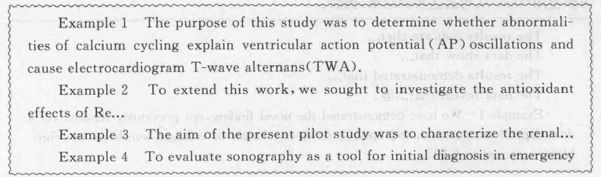 简要陈述研究宗旨,说明研究要解决的问题,一般只用一句话来表达。表达目的的常用英语词组为动词不定式,不同的研究目的用不同的不定式。诸如:为研究--to study,to investigate;为评价--to evaluate;为探索--to explore;为观察--to observe;为检测、测定--to examine,to determine;为确定……的特征--to characterize;为证实证明--to confirm,to demonstrate;为比较--to compare;为提供--to prove;为阐明--to explain 等。