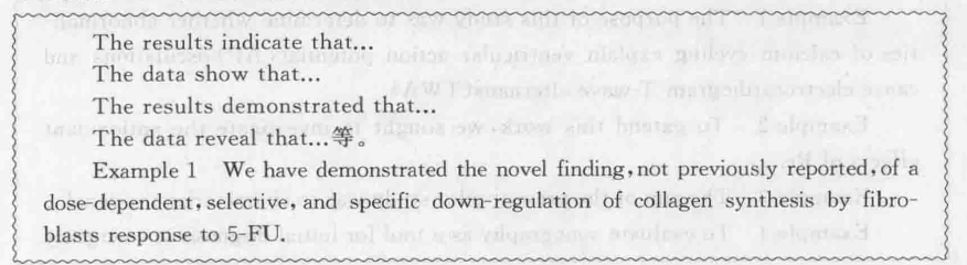 摘要中的研究结果应包括本研究所获得的新资料、新数据、新结果等。这是摘要的根本所在,应该多着墨在此,把主要结果介绍清楚,以免造成“空洞无物”之嫌。不少论文常习惯使用“that”从句表达实验结果,例如: