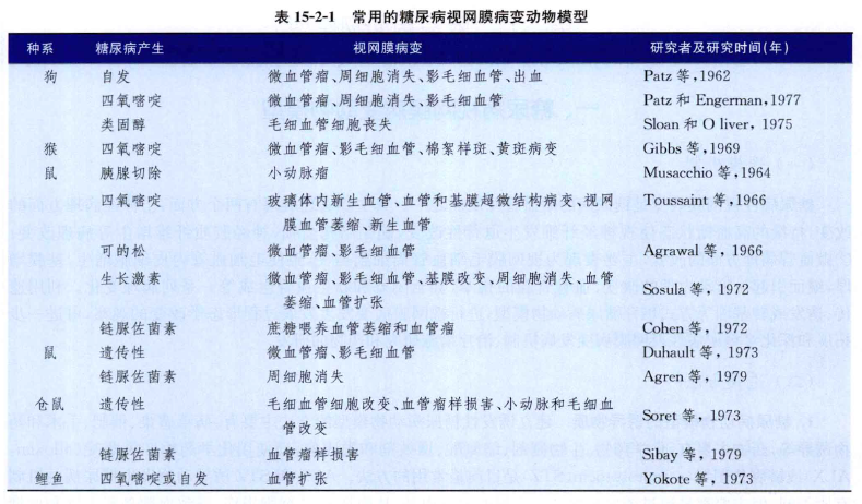 糖尿病视网膜病变动物模型是在糖尿病模型基础上发展而来。糖尿病动物模型主要有自发性遗传性动物模型、诱发性动物模型和转基因动物模型。自发性遗传性动物模型对动物的种属、繁殖和饲养条件要求较严格,提供实验用的数量有限,故实际应用受到限制。诱发性糖尿病动物模型造模方法简单易行,是目前应用较广泛的模型。常用的实验动物有猴、猫、狗、猪、鼠等,因其视网膜有精细复杂的血管网,可用于糖尿病视网膜病变实验研究(表15-2-1)。