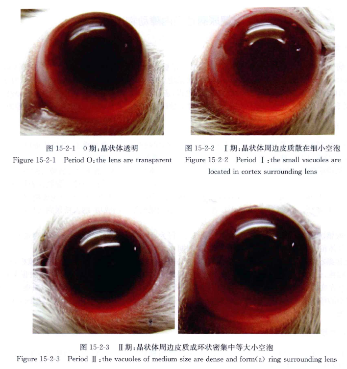 每隔3天以复方托品酞胺眼液散瞳,用裂隙灯显微镜检查大鼠品状体形态并记录各组大鼠晶状体混浊的发生时间。依据丁正华、严宏分类法,将晶状体混浊分为6期。