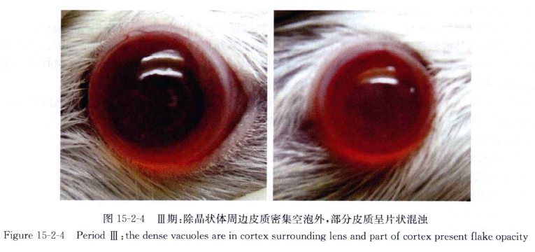 Ⅱ期:晶状体周边皮质成环状密集中等大小空泡(图15-2-3)。