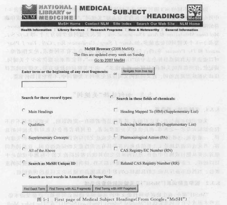 图5-1是“MeSH”检索网的首页。进入“MeSH”检索网首页后,选择关键词的路径和方法如下: