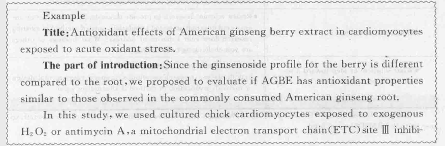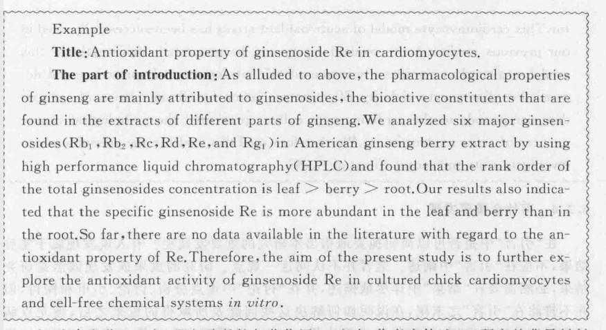 在《人参皂苷Re对心肌细胞的抗氧化作用》一文中,作者在简述Re研究的背景材料和研究进展之后,明确地说明了所存在的问题,即到目前为止,尚无有关Re抗氧化作用的详细报道资料可被利用,紧接着就提出本研究的目的等。这种写法不仅合乎情理,而且是很容易被理解和接受的。