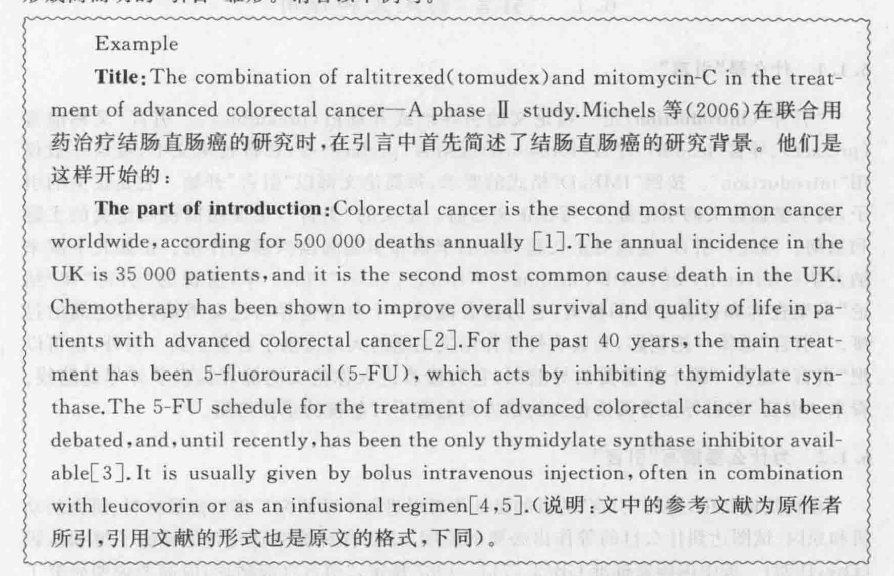 从J Michels等的这段描述背景的引言中可以看出,作者只用了6句话,106个字就概述了结肠癌、直肠癌的流行病学及其治疗的现况。这是十分简要和十分精炼的概括性描述。需要注意的是作者在此引用了5篇参考文献,这些资料为简化“引言”中的文字起了十分重要的作用。因此,引证是撰写“引言”的基本条件,没有引证,“引言”就不复存在另外,引用这些文献也明确地告诉读者,这些背景材料绝非虚构,而是有根有据的。