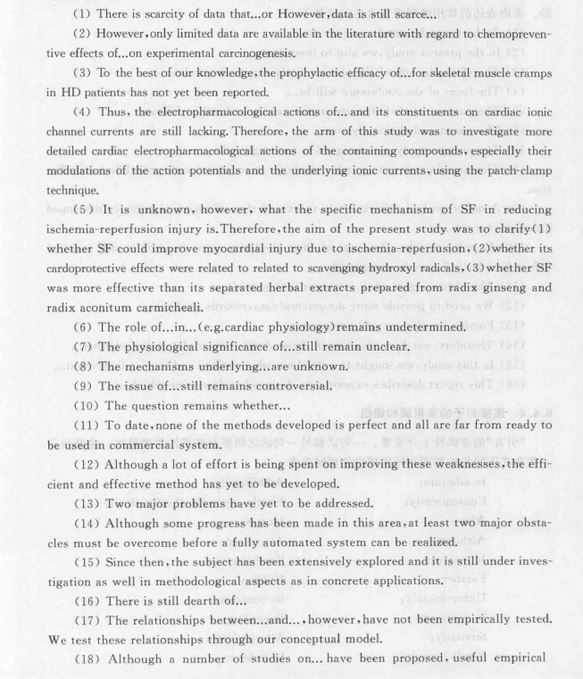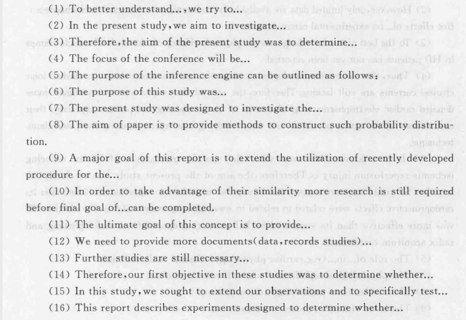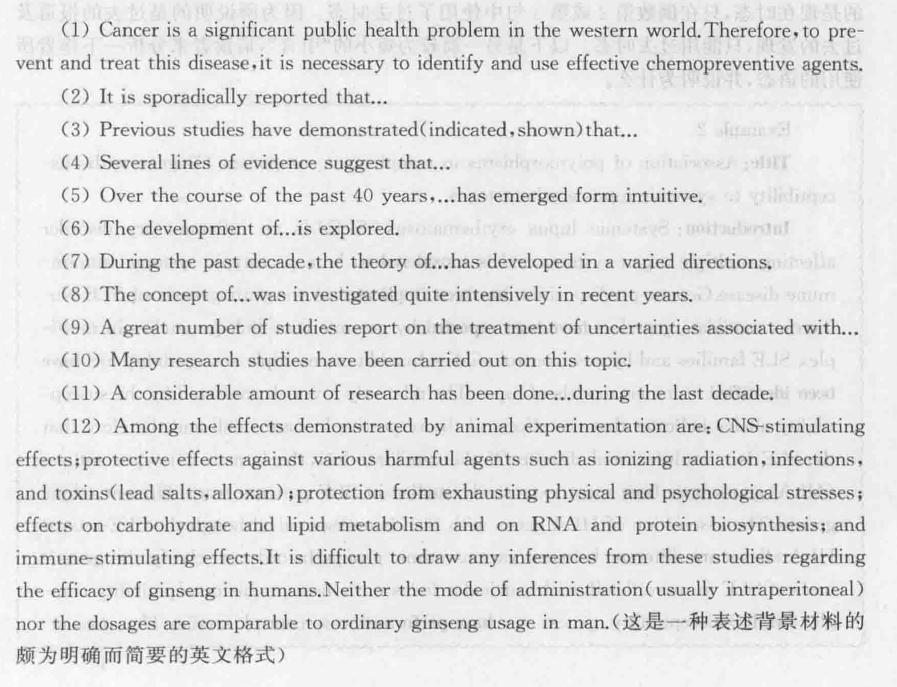 “引言”中的英语表达形式很多,建议你在阅读论文时,留心把常用的英文词组或句子记下来,以方便自己模仿和使用。这里笔者只能提供有限的、可被接受的、常用的词组和表达方式,供读者参考使用。为了使用方便,这里分门别类地摘录如下。
