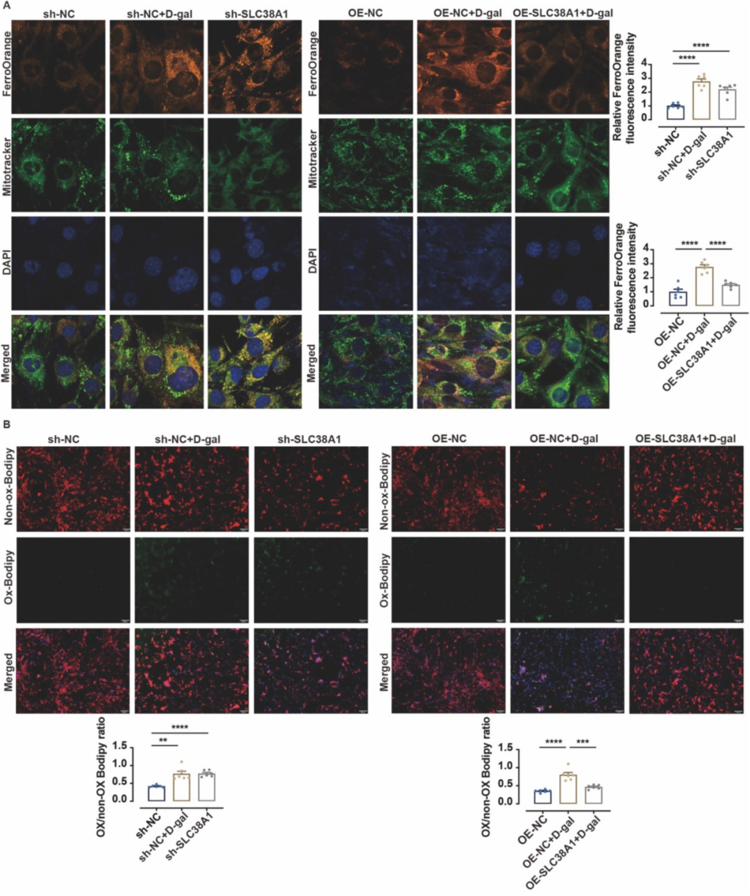 图2. SLC38A1在D-gal处理的C2C12细胞中发挥保护作用,减轻铁过载和脂质过氧化。