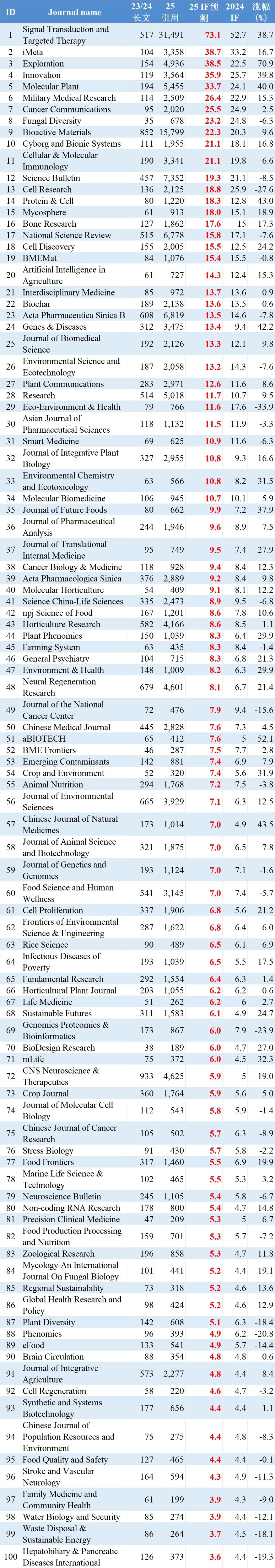 以下为 100 本期刊 2025 年 IF 预测结果(数据检索与统计日期:2025 年 11 月 3 日):