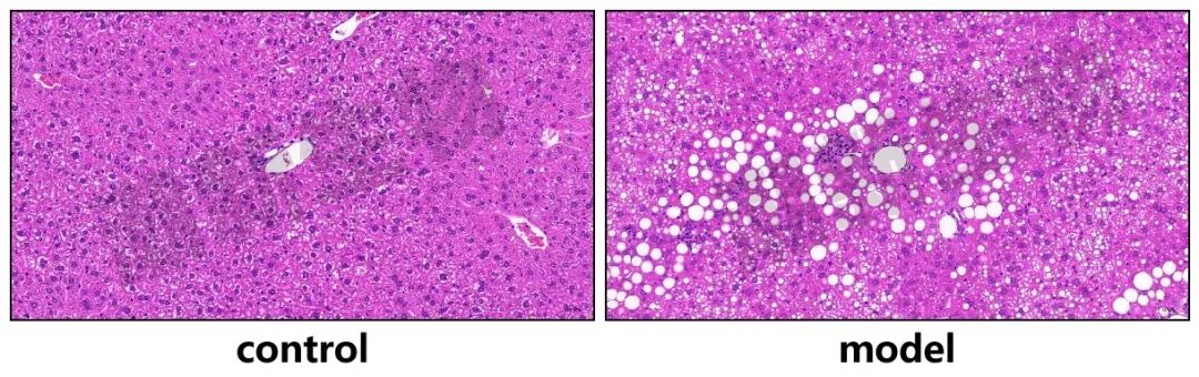 针对NAFLD方向,团队采用C57BL/6J小鼠+蛋氨酸限制胆碱缺乏高脂饲料(MCD,高脂供能)方案,4周即可形成较为典型的脂肪肝表型。