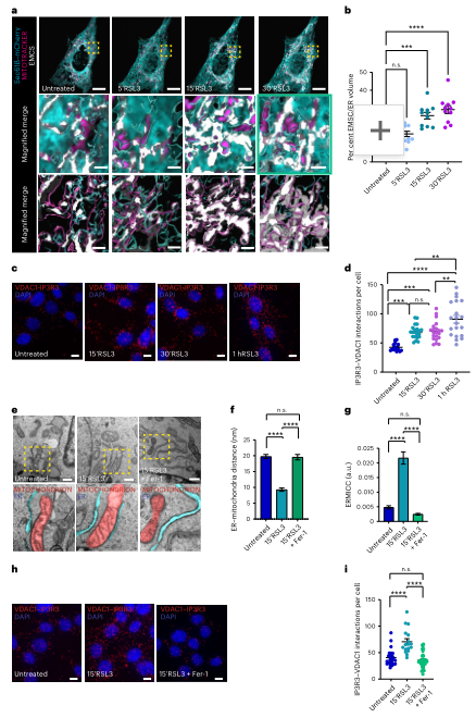 在铁死亡诱导剂 RSL3 作用后,作者观察到 EMCS 在数分钟内快速扩张。ER 标记 Sec61β–mCherry 与 MitoTracker 的共定位体积急剧增加,白色的 EMCS mask 在 5–30 分钟呈现明显膨胀。量化结果显示,EMCS 占 ER 的比例从基线迅速升高,且包含多次独立实验重复。通过原位 PLA,IP3R3–VDAC1 的交互点数量随时间持续增加,提示结构紧密化。TEM 进一步确认 EM 与线粒体的距离在铁死亡触发后缩短,而抗氧化剂 Fer-1 可阻断这种接触扩张,证明 EMCS 重塑依赖脂质过氧化压力。