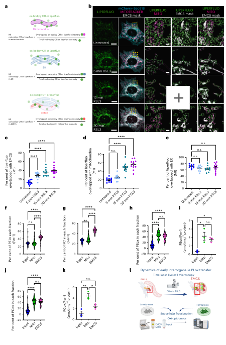 作者进一步追溯 PLox 的空间轨迹。使用 Liperfluo 追踪脂质氧化信号,通过 Mander’s 系数定量其在不同亚细胞结构中的富集度。结果显示:PLox 在 5 分钟内最先显著富集于 EMCS,而此时线粒体与 ER 的富集尚不明显;在 15–30 分钟,PLox 才逐步向线粒体扩散。也就是说,脂质过氧化有明确的空间顺序:先 EMCS,后线粒体。脂质组学数据表明 EMCS 天然富集 PUFA-PE/PC,这些“高风险脂质”使其成为铁死亡易燃区;氧化 PEox、PCox 的比例在 EMCS 与线粒体均升高,而 CL 氧化则更偏向线粒体,符合其膜特性。
