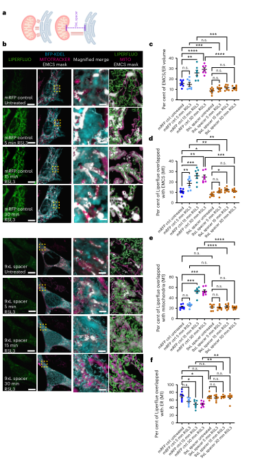 作者进一步测试“物理拉远 EMCS”是否能保护线粒体。利用 9×L spacer 延长 ER–mito 距离,使两者难以形成致密接触。在活细胞成像中,表达 9×L spacer 的细胞,EMCS mask 的形成在 RSL3 刺激后明显受抑制,量化显示 EMCS 占 ER 体积比例增长受限。更关键的是,Liperfluo 在 EMCS 与线粒体中的富集大幅度被压制,表明 PLox 的跨结构传播受到阻断。也就是说,单纯改变几纳米的空间距离,就能显著干扰铁死亡链条,揭示铁死亡具有强烈的结构依赖性。