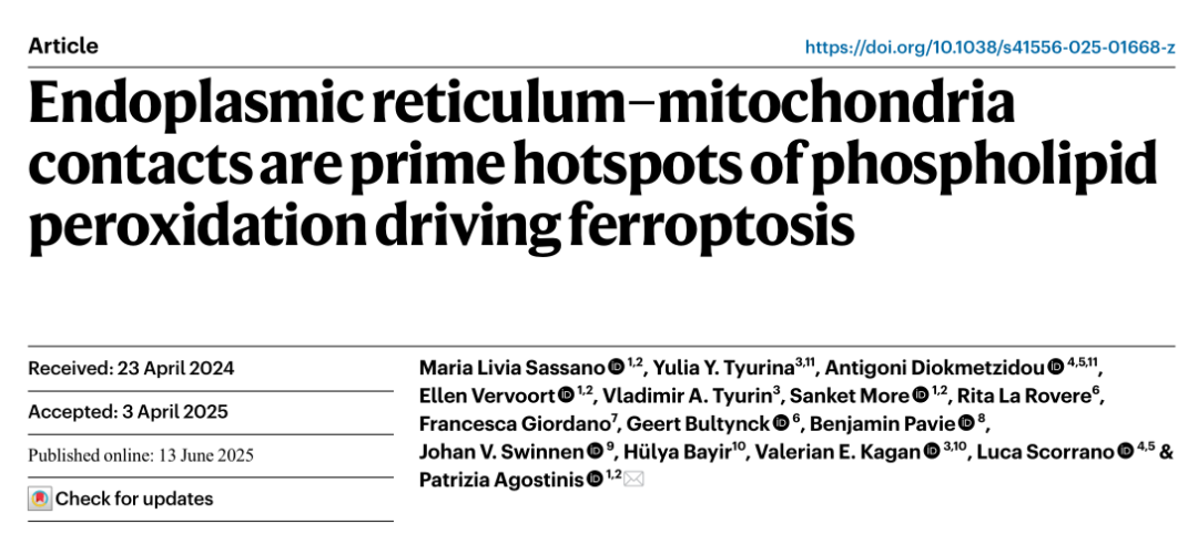 近日,意大利帕多瓦大学与多中心合作团队在 Nature Cell Biology(IF≈28)发表重磅研究,题为《Endoplasmic reticulum–mitochondria contacts are prime hotspots of phospholipid peroxidation driving ferroptosis》。文章由 Simone P. Figarola 等为一作,Cristina Mammucari 为通讯作者。