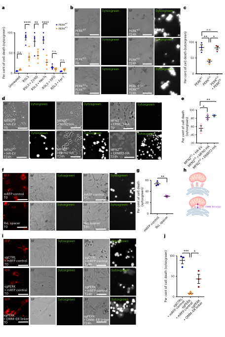 作者考察 EMCS 紧密化对铁死亡敏感性的直接影响。细胞死亡实验显示,PERK KO 明显抗铁死亡,而重新表达 PERK 能恢复敏感性。进一步在 MFN2 KO 背景中引入 ER–mito tether(ERMIT2-HA)可强化 EMCS,使细胞对 RSL3 更易死亡。相反,加入 9×L spacer 则保护细胞、降低死亡率。总体而言,EMCS 的紧密化不是被动现象,而是铁死亡推进链条的核心步骤之一,EMCS 的物理与分子强化都足以提升死亡敏感度。