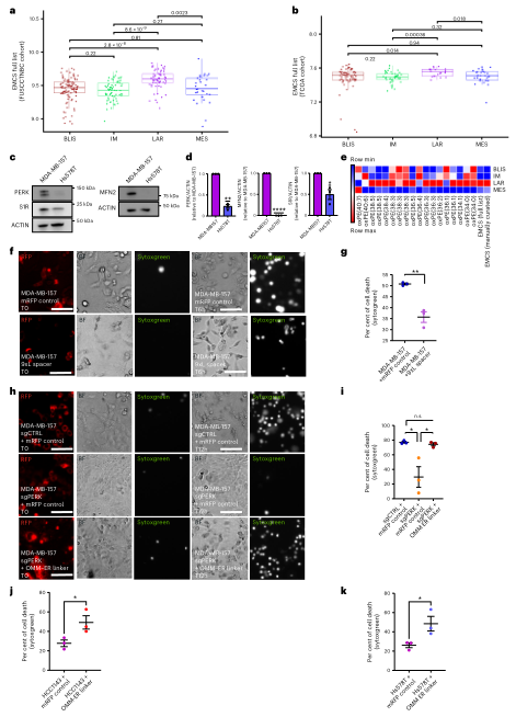最后,作者将 EMCS 结构特征与三阴性乳腺癌(TNBC)分析结合。通过 ssGSEA 比较不同 TNBC 亚型,发现 EMCS 富集分数在亚型间差异明显,BLIS、IM 的 EMCS 指标较高,与铁死亡敏感性呈正相关。继续在 MDA-MB-157 和 Hs578T 等细胞系中验证,EMCS 丰富度越高,RSL3 诱导下细胞死亡越显著。强行增加 EMCS(OMM–ER linker)会提升铁死亡敏感性,而拉远 EMCS(9×L spacer)则降低死亡率。TNBC 中的 EMCS 结构状态因此成为铁死亡治疗潜在的预测指标和干预靶点。
