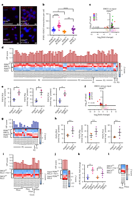 为了理解 EMCS 为什么是“起火点”,作者进行了大规模脂质组分析。统计显示 EMCS 天然富集 PUFA-PE、PUFA-PC 等典型铁死亡易感脂质,且这些脂质在 RSL3 刺激后迅速升高。火山图与 heatmap 清楚标记出 PE40:8 等“双 PUFA”脂种在 EMCS 的强富集趋势。PERK 缺失改变了 EMCS 的脂质组成,使 PUFA-PL 的富集度下降,并减弱氧化脂质的累积。进一步分析显示,EMCS 与线粒体之间的氧化 PL 分布模式具有高度一致性,符合前述“起源于 EMCS、再扩散至线粒体”的空间路径。