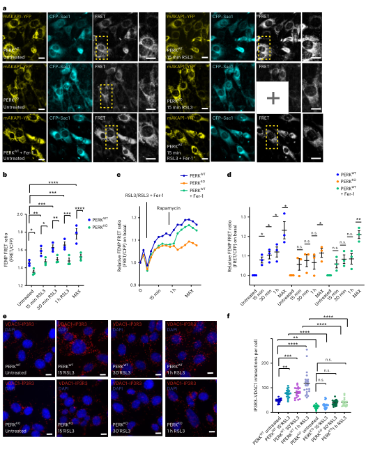 为了探究 EMCS 扩张是否需要特定蛋白因子,作者关注 PERK。利用 FRET 监测 EM–mito 距离,在 PERK 缺失细胞中,RSL3 诱导下的 EMCS FRET 信号上升显著受阻,说明 EMCS 扩张依赖 PERK。时间轨迹显示,PERK 缺失细胞的 EMCS 重构明显迟缓,且在 rapamycin 等条件下仍存在差异。此外,IP3R3–VDAC1 的原位 PLA 交互点在 PERK KO 细胞中的上升幅度也被削弱,确认 PERK 参与调控 EMCS 扩张的动力。总体来看,PERK 是铁死亡中 EMCS 结构重塑的关键调控分子,其缺失能显著抵消脂质氧化驱动的接触扩张。