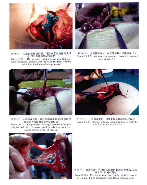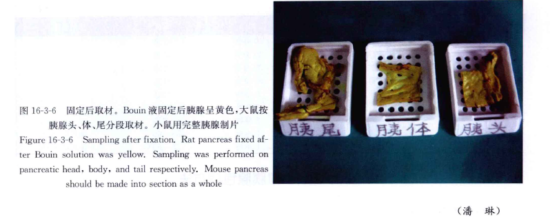 取好的胰腺立即放入新鲜配制的 Bouin 液中浸泡固定10~12小时,换入75%乙醇溶液中。胰腺离体后很容易自溶,所以一定要立即固定。