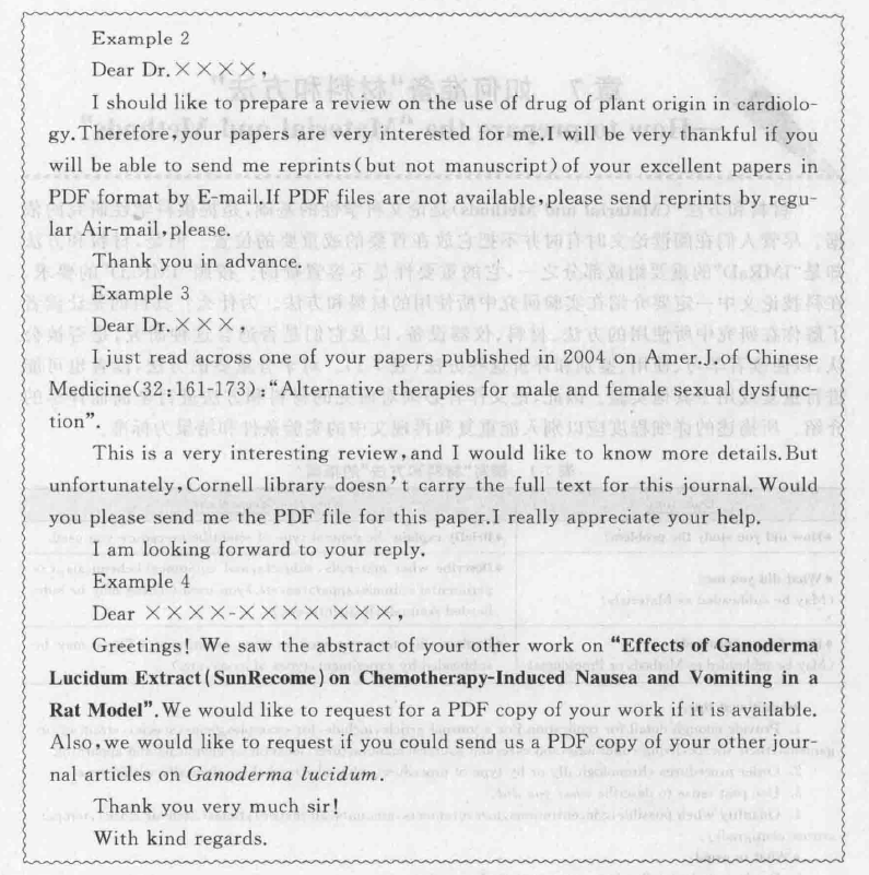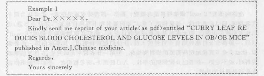 另外,还有一种情况需要说明,发表在地区性的杂志或较为冷门的杂志或刚出版发行的新杂志中的论文,它们的题目或文摘可能会被收录。因此,你可能从网上得到某些信息而向作者索取。在这种情况下,作者有可能没有论文的全文,更没有“PDF”格式的全文,当然不可能通过“E-mail”寄给你。遇到这种情况,犹如下面所引的Example2和Exam-ple4所示,你应该“一箭双雕”,两者均要。既要“reprint”,也要“PDF”格式的全文,这样可能就万无一失了。以下展示的几封“E-mail”是作者最近收到的索取文献的信文,作为“Example”,供初学者参考。但需说明一点,这些“Example"并不是范文,只是想让读者了解一下实际情况,看看在西方国家里,他们是怎样写索取信的。