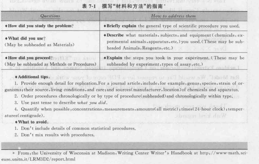 “材料和方法”(Material and Methods)是论文科学性的基础,是提供科学性研究的依据。尽管人们在阅读论文时有时并不把它放在首要的或重要的位置。但是,材料和方法却是“IMRaD”的重要组成部分之一,它的重要性是不容置疑的。按照“IMRaD"的要求,在科技论文中一定要介绍在实验研究中所使用的材料和方法。为什么?其目的是让读者了解你在研究中所使用的方法、材料、仪器设备,以及它们是否适合这种研究,是否被公认,以便读者学习、使用、鉴别和评价这些方法(表7-1)。对十分重要的方法,读者也可能进行重复或用于其他实验。因此,论文作者必须对研究的材料和方法进行全面而详尽的介绍。所描述的详细程度应以别人能重复和再现文中的实验条件和结果为标准。