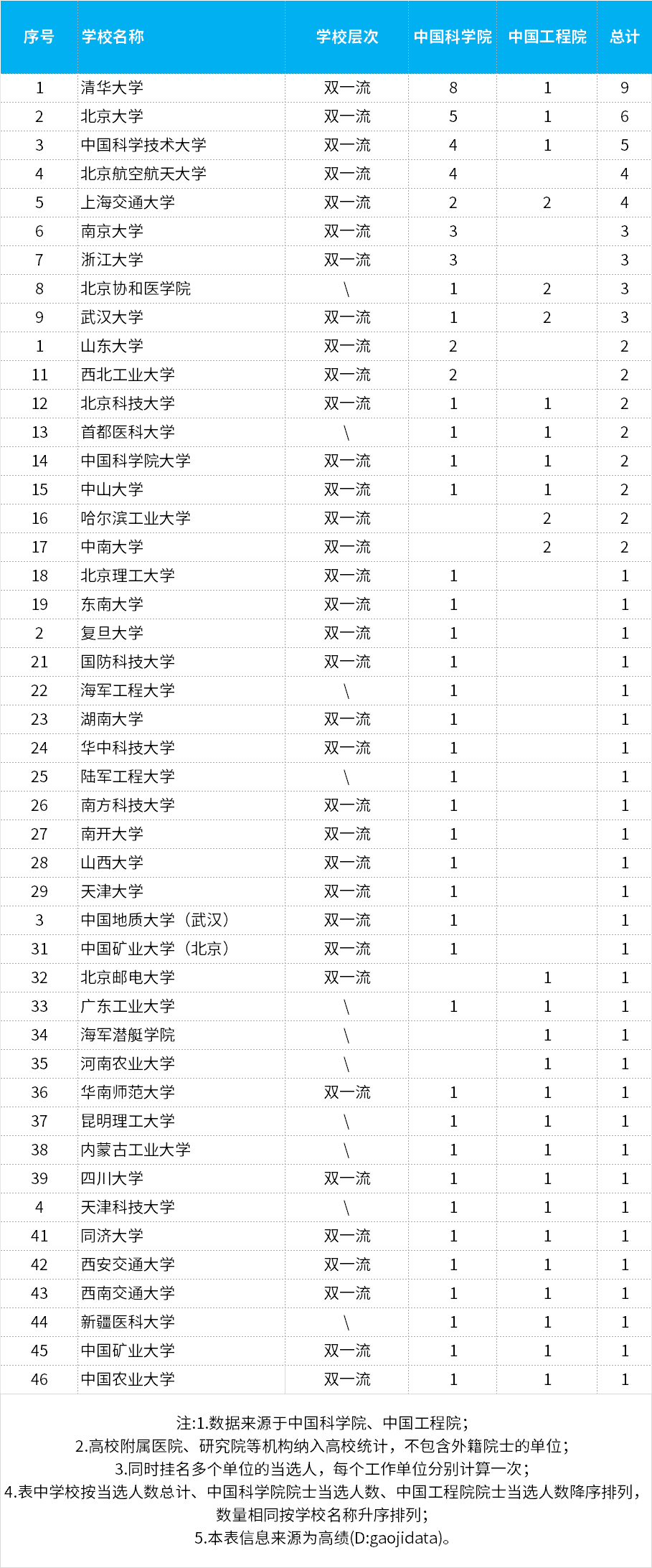 据统计,当选总人数最多的高校是清华大学,共9位,其中,中国科学院院士8位,中国工程院院士1位;其次是北京大学,共6位,其中,中国科学院院士5位,中国工程院院士1位;第三是中国科学技术大学,共5位,其中,中国科学院院士4位,中国工程院院士1位。