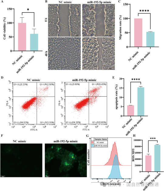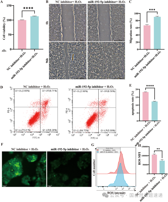 顺着这条观察往下看,在细胞水平,miR-192-5p 的作用几乎是全方位的,会降低 HaCaT 细胞的活力,削弱迁移能力,增加凋亡,同时推高 ROS。换句话说,它让受损皮肤细胞从代谢到应激的各个环节都陷入了被动。相应地,当 miR-192-5p 被抑制后,这些变化又能逆转回来。