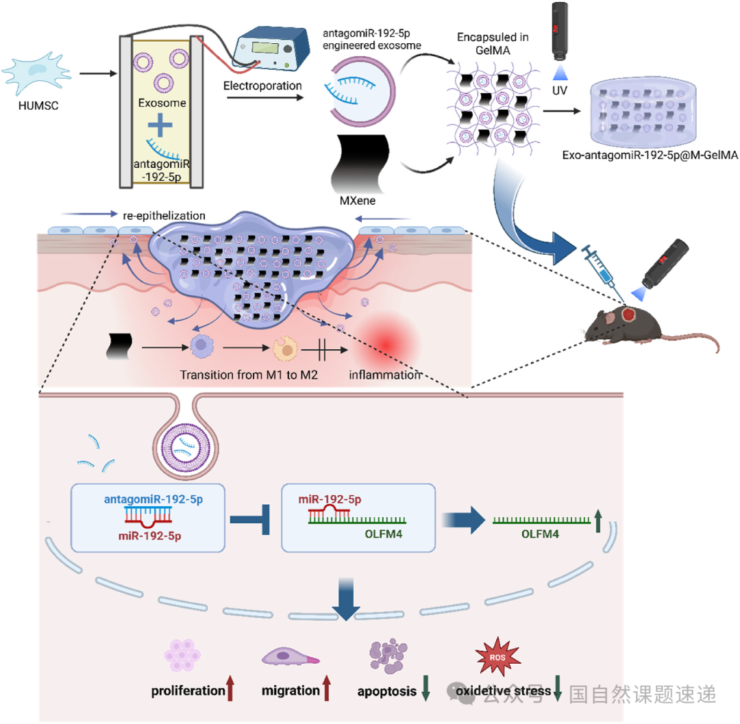 研究的最后,作者用一幅示意图把整个治疗链条整理出来:从烧伤后 miR-192-5p 上升、OLFM4 被抑制、上皮修复受阻的病理状态,一直到使用 Exo-ant-192@M-Gel 将这条轴线“逆转”,恢复细胞活性、减轻炎症、加速创面闭合的过程。