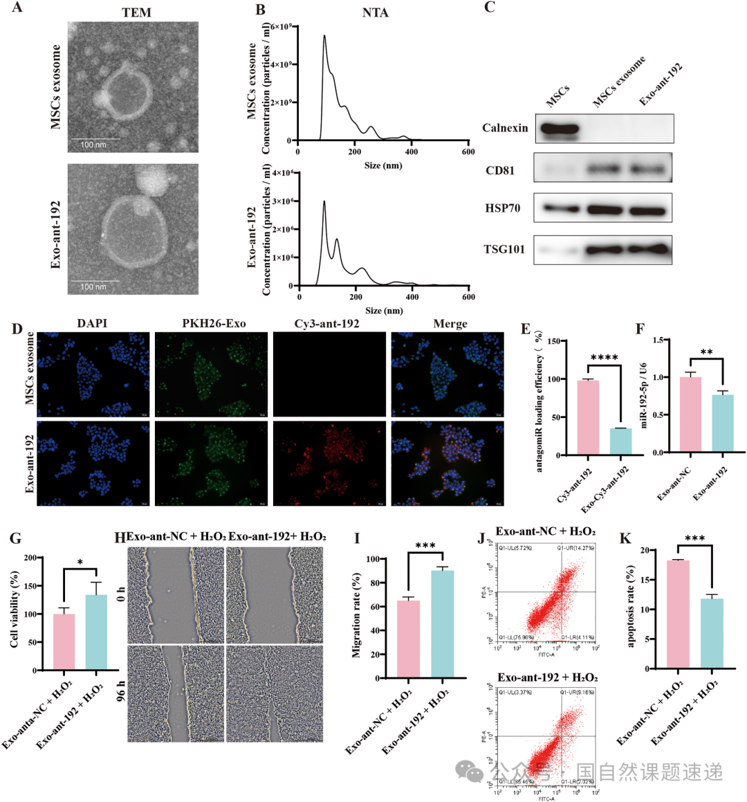 为了解决这一层障碍,作者选择用 MSC 来源的外泌体来承载 anti-192。外泌体本身就是细胞之间交流信息的天然载体,结构稳定,又容易被靶细胞摄取,非常适合用来运送核酸类分子。研究中构建的工程外泌体 Exo-ant-192,在形态、粒径、外泌体标志物等方面都通过了标准表征,同时证实 HaCaT 细胞可以高效摄取这些外泌体,细胞内 miR-192-5p 水平因此明显下降,细胞活性、迁移能力和抗凋亡能力得到恢复。