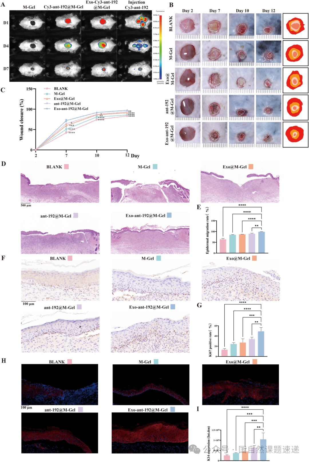 在体内实验中,作者把不同处理方式覆盖在烧伤创面上进行直接对比。结果显示,Exo-ant-192@M-Gel 组不仅在早期就能明显缩小创面面积,还在整个观察周期内保持着最高的愈合率。H&E 染色显示其肉芽组织更成熟、上皮重建更完整,Ki67 标记提示局部细胞增殖更活跃,而 CK14 免疫荧光则说明新的上皮层结构更接近正常皮肤。更重要的是,通过带有荧光标记的 miRNA 成像可以看到,Exo-ant-192@M-Gel 能在创面区域保持更长时间的信号,说明有效成分并没有很快流失。
