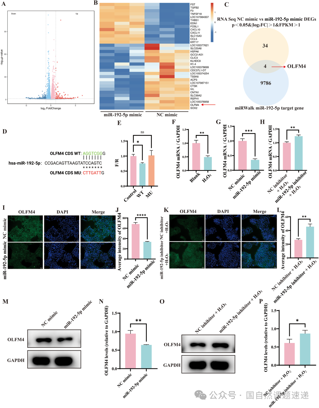 miR-192-5p 并不是单独行动,它抑制的是一个叫 OLFM4 的下游靶基因。作者从差异基因分析做起,结合靶点预测数据库,把候选范围一步步缩窄,最终锁定 OLFM4。通过野生型和突变型 3′UTR 的荧光素酶实验,他们证明 miR-192-5p 可以直接结合 OLFM4 相关位点,从而压制其表达。进一步的 RT-qPCR、Western blot 和免疫荧光结果显示,在氧化应激和 miR-192-5p 过表达的条件下,OLFM4 的 mRNA 与蛋白水平均明显下调,而敲低 miR-192-5p 则能把这部分表达拉回来。