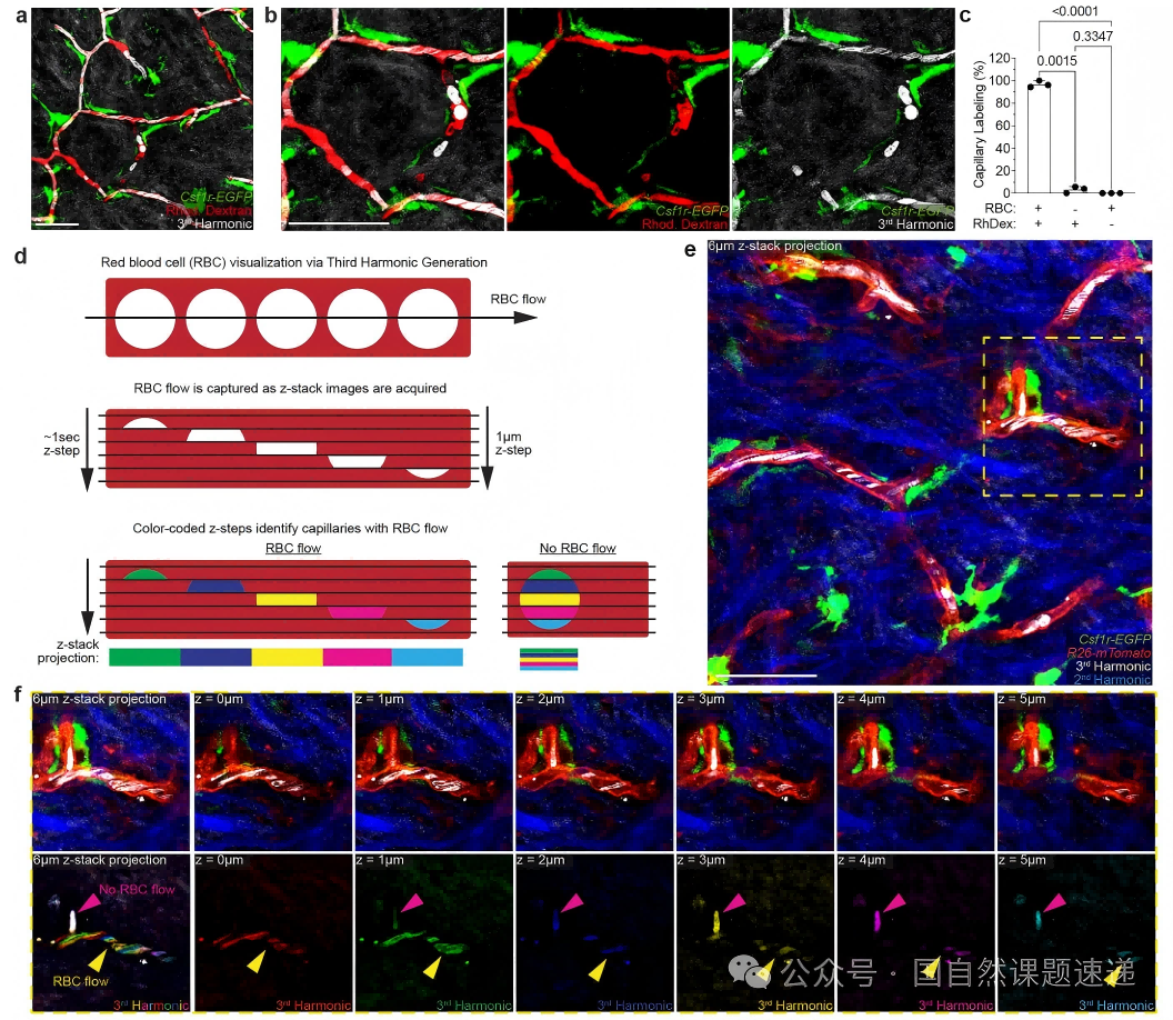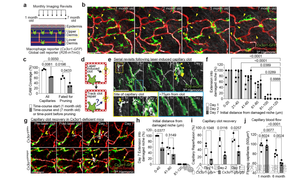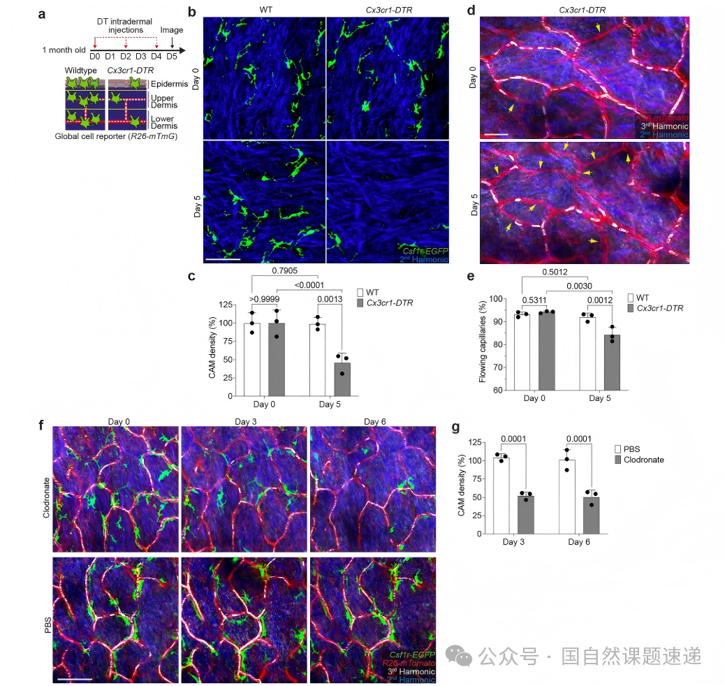 研究采用活体双光子显微成像,对同一只小鼠的同一片皮肤区域进行跨周、跨月的重复回访,连续追踪浅表毛细血管丛与周围巨噬细胞的空间关系与动态变化。为获得血流功能读数,作者利用三次谐波信号对红细胞运动进行无标记可视化,从而把毛细血管段的通畅状态、阻断发生与再灌注过程转化为可量化指标。在此基础上,研究通过局部激光诱导毛细血管血栓建立急性损伤模型,并结合局部巨噬细胞消融、条件基因操控以及局部生长因子补充等手段,比较不同干预条件下的再灌注轨迹与长期血管稳定性。由于实验在同一成像平台与同一读数体系下完成,能够在空间与时间两个维度上将结构变化与功能后果对应起来,并进一步推进到机制验证。