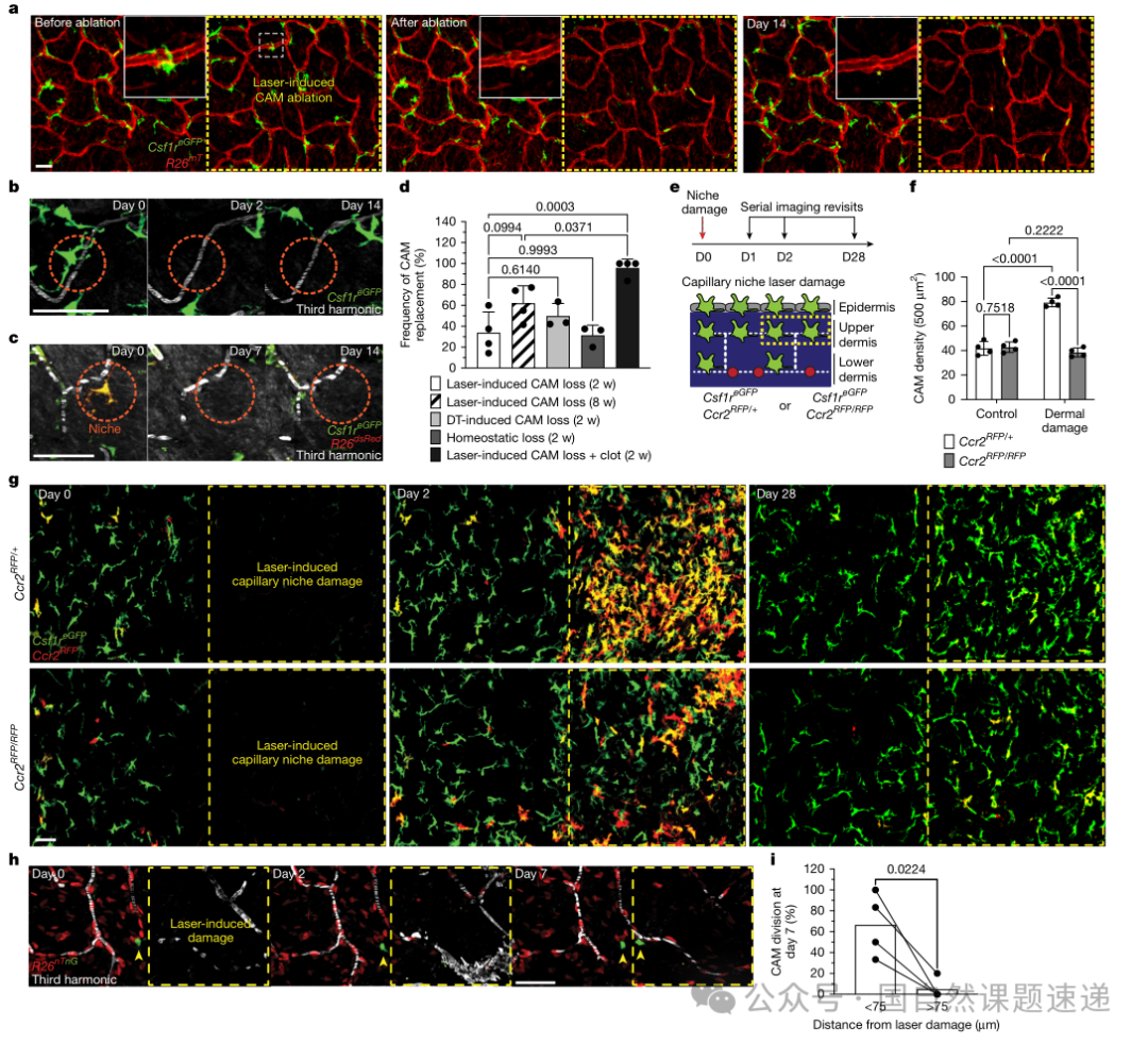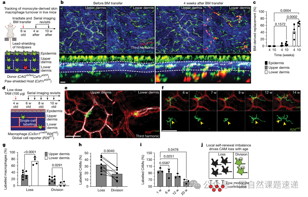 图3 真皮巨噬细胞采用生态位特异性的自我更新策略,导致随年龄出现选择性CAM丢失