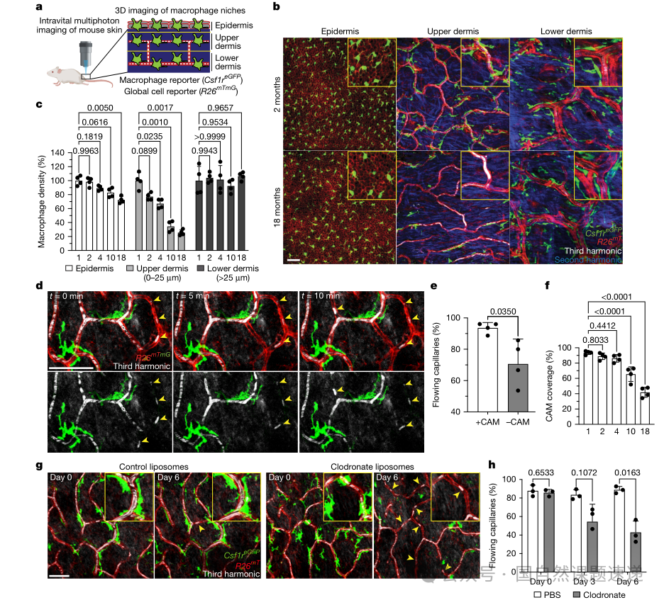 皮肤浅表毛细血管丛位于表皮下方,结构边界清楚,血流状态也可以在活体条件下直接观察。随着年龄增长,浅表毛细血管网络会逐渐稀疏,局部灌注稳定性下降,部分毛细血管段出现红细胞停滞甚至持续阻断。传统解释常集中在内皮细胞功能衰退或全身炎症改变,但这些解释难以回答一个更具体的问题:在毛细血管仍然存在的情况下,为什么血流更容易在局部失稳,以及这种失稳是否与血管周围的常驻免疫细胞变化有关。本文围绕毛细血管相关巨噬细胞(CAMs)展开,提出并验证了一个可追踪的过程:在皮肤上真皮的特定生态位中,CAMs随年龄发生选择性减少,其减少幅度超过毛细血管数量本身的下降,由此出现“巨噬细胞覆盖不足”的毛细血管段,这些区域更易发生血流阻断且修复能力下降,从而推动毛细血管老化的功能表型。