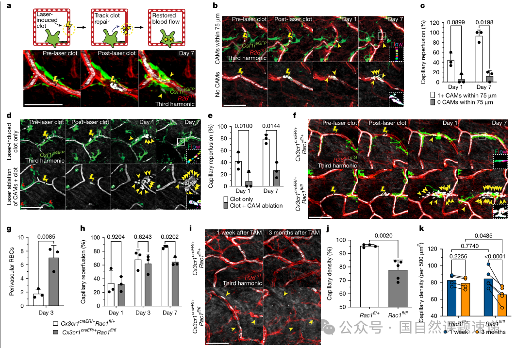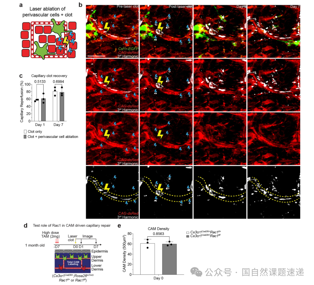为确定CAMs在修复中的功能角色,作者在单根毛细血管段建立激光诱导血栓模型,并以长期回访方式记录再灌注发生与否及其时间进程。在该模型中,研究先对局部CAM进行消融,再在相同位置诱导血栓,结果显示再灌注显著受损,部分毛细血管段长期无法恢复稳定血流。为排除非特异性效应,研究对周围非巨噬细胞进行相似处理并未产生同等的修复缺陷,同时在该模型条件下也未见典型的中性粒细胞集群反应,从而将修复差异指向CAM本身。机制层面,连续成像提示血栓与血管壁事件后局部出现血管外红细胞碎片与残骸,CAM会对这些结构进行包裹与吞噬。随后作者在CAM中进行Rac1条件性缺失,以削弱吞噬能力而尽量避免仅由细胞数量变化带来的解释偏差。结果表明,即便CAM数量未显著减少,残骸清除与再灌注仍明显下降,且长期追踪可见毛细血管修剪加快,说明吞噬清除过程与血管通畅恢复具有直接关联。