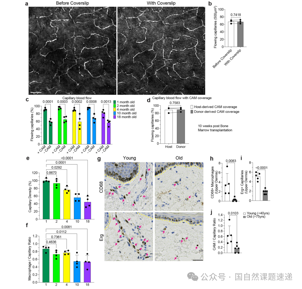 发现一:上真皮CAMs随年龄下降并与毛细血管血流受损相伴