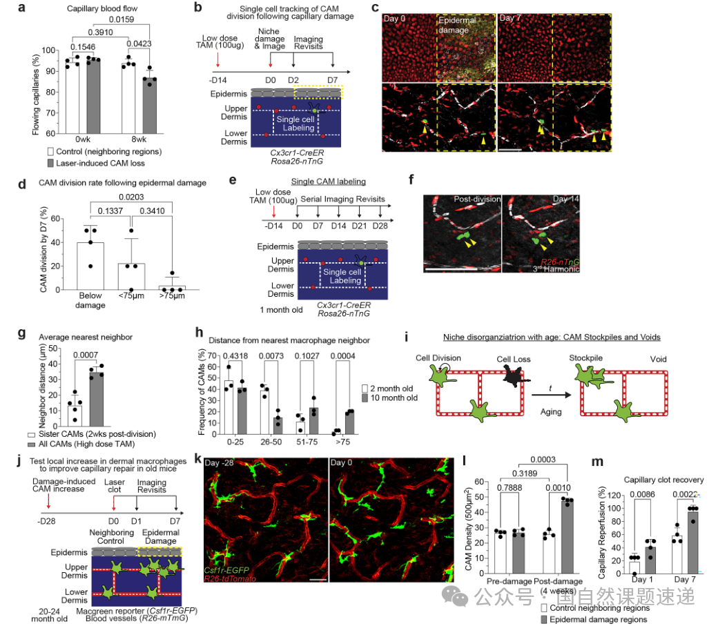 研究进一步追问为什么CAM减少后难以恢复。通过骨髓嵌合等来源追踪,作者发现上真皮巨噬细胞的骨髓来源贡献比例很低,提示上真皮CAM主要依赖局部自我增殖维持,而并非持续由外周单核细胞补充。基于这一背景,作者系统观察CAM减少后是否会出现快速补位。无论是局部消融造成的缺失,还是遗传方式引导的减少,或是谱系追踪下的自然丢失,研究均显示单纯“数量减少”本身并不足以引发迅速的补位更新,部分毛细血管段可在较长时间内处于覆盖不足状态。与此同时,作者还提出并验证了空间限制因素:CAM对损伤诱导的反应具有空间作用范围,邻近区域的巨噬细胞更可能参与补位与修复。年轻皮肤中CAM密度较高,覆盖区域之间存在较多重叠,因此毛细血管段较少处于完全缺乏覆盖的状态;随着年龄增长,密度下降导致覆盖间隙扩大,越来越多毛细血管段落入空缺区域,从而更易发生血流失稳并在损伤后难以恢复。该发现说明更新机制对“损伤信号与生长支持”的依赖大于对“空位本身”的感知,空缺因此能够在时间尺度上逐渐积累并转化为可观测的功能障碍。