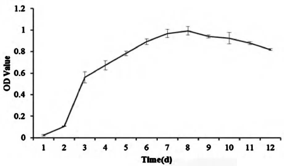 神经细胞活性检测采用MTS法,使用酶标仪在490nm波长下测光密度(OD值),OD值越高说明细胞活性越强。将10μL的MTS检测试剂加入到96孔板中,测定1、2、3、4……12d的神经细胞活性神经细胞活性。用酶标仪检测波长在490nm的吸光度值(OD值),OD值越高说明细胞活性越大。实验需重复3次,取5组孔,以OD值为纵坐标绘制海马神经元生长曲线。