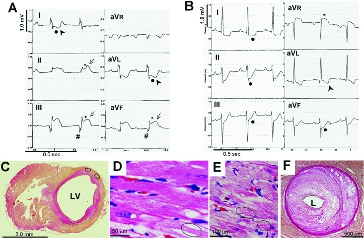 L,冠状动脉管腔;箭头,高T波;*,ST段抬高;箭头头,T波倒置;•,ST段压低;#,深Q波。