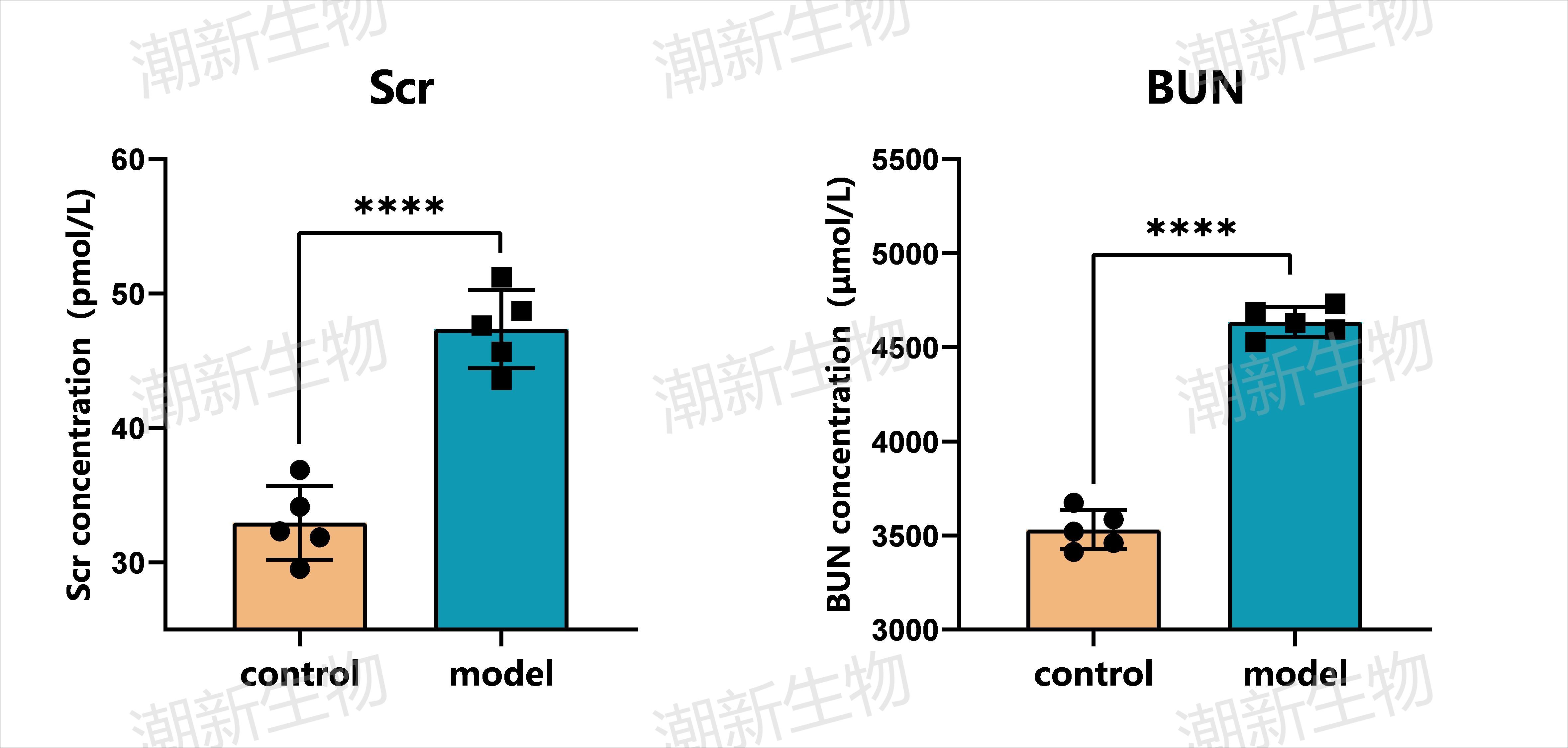 以单侧输尿管结扎诱导肾纤维化结果为例:术后4周,检测大鼠Scr(血肌酐)、BUN(尿素氮),与control组相比,model组大鼠Scr、BUN显著升高。HE结果显示control组肾小球形状规则,肾小管集合管结构清晰,间质未见炎性细胞浸润;model组肾小球及毛细血管内充血,肾小管扩张,间质炎性细胞浸润。Masson结果显示control组仅肾脏血管周围存在胶原纤维;model组可见肾间质广泛性纤维化。