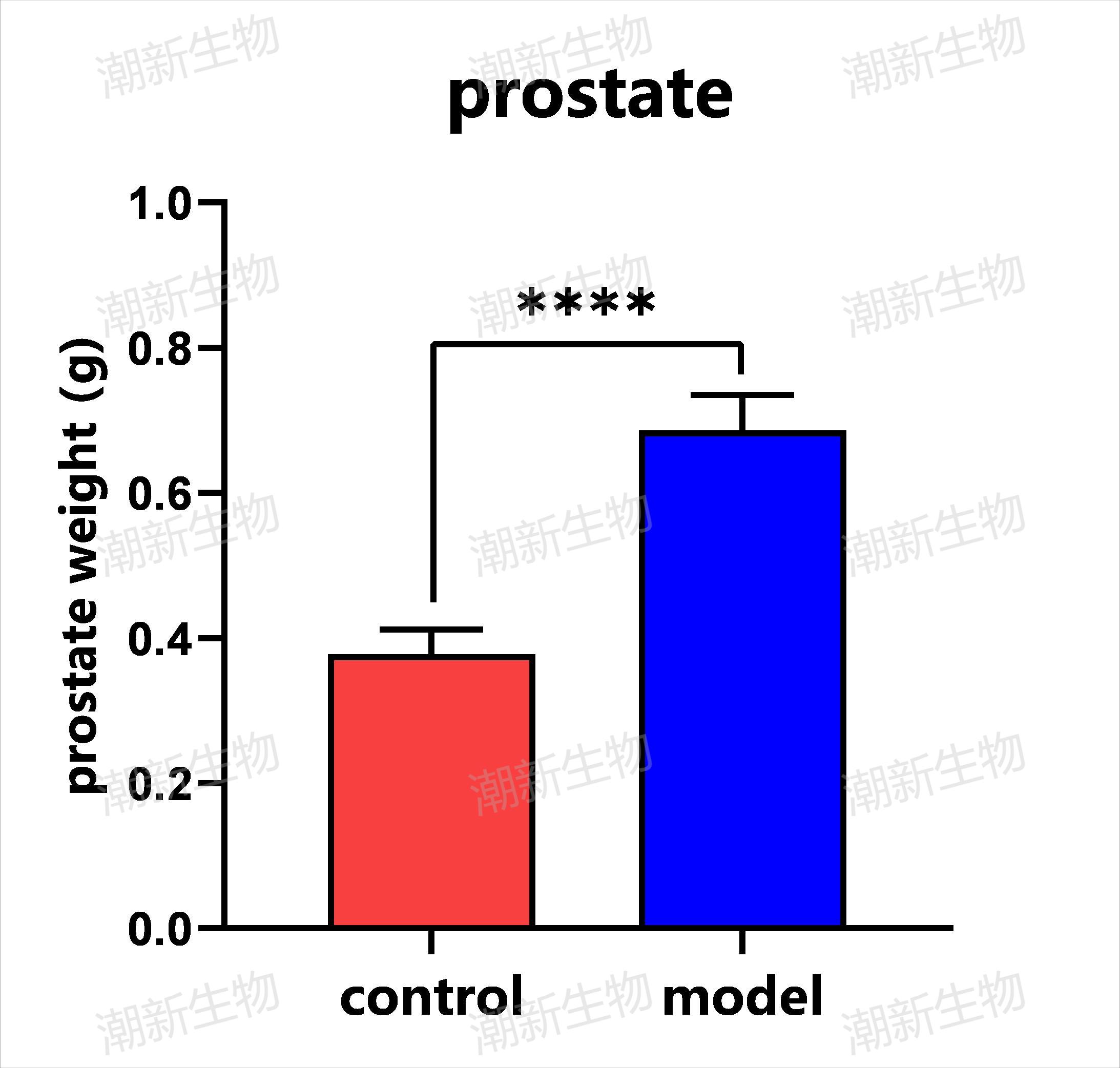 给药结束1周后取材前列腺并称重,结果显示:与control组相比,model组大鼠前列腺重量显著增加。HE结果显示:control组大鼠前列腺腺体排列有序,腺腔无扩张,腔内表面光滑。model组腺体排列紊乱,上皮增生明显,呈乳头状,腺腔扩张。