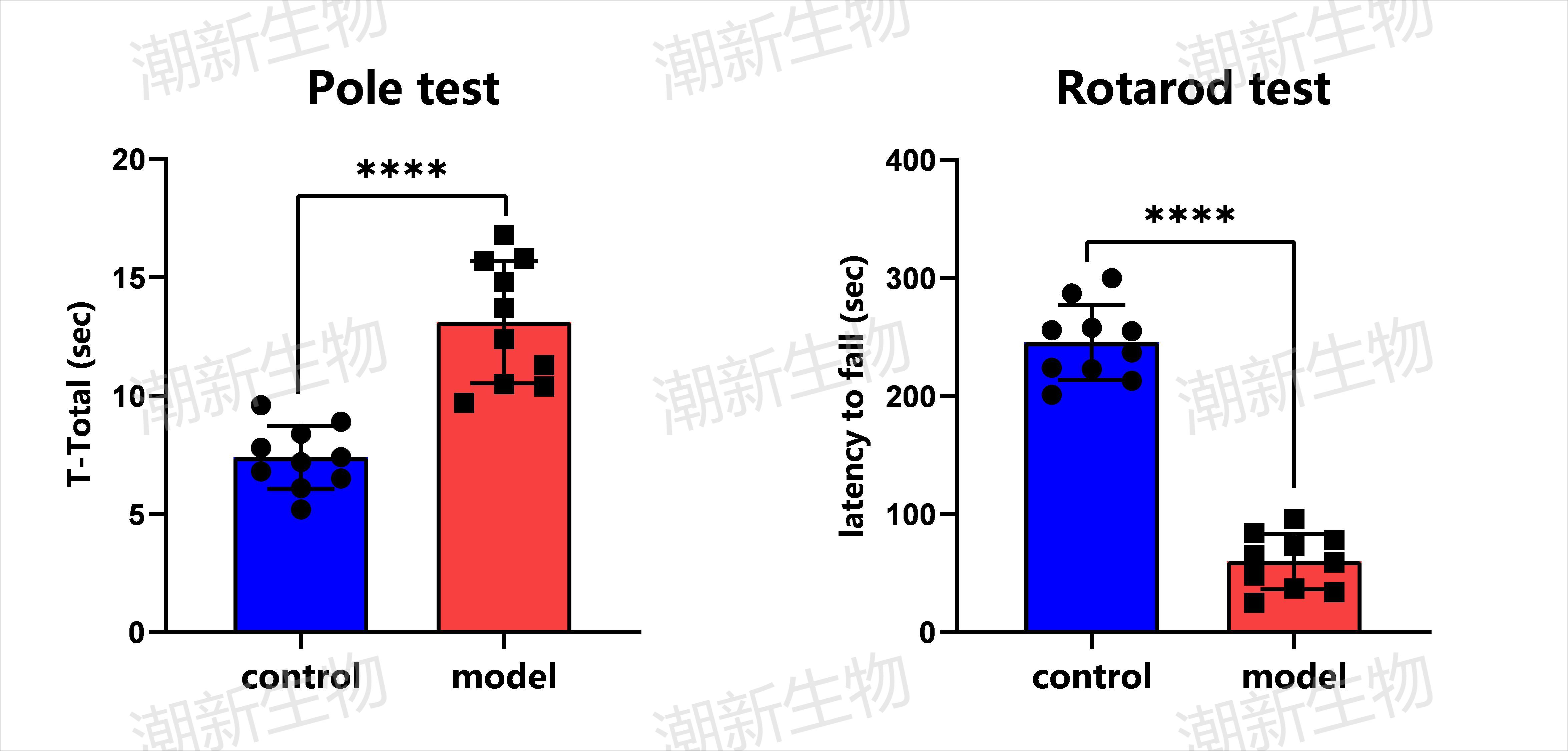 末次给药1周后对小鼠进行爬杆测试和转棒测试,结果显示:与control组相比,model组小鼠爬杆总时间显著增加,在转棒上的时间显著减少。