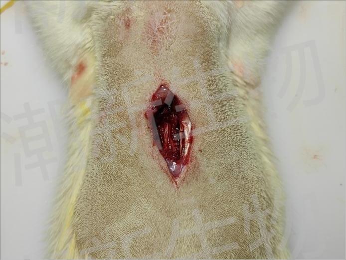 选取8周龄雄性SD大鼠,1%戊巴比妥钠(40mg/kg)腹腔注射麻醉动物,腹部朝下四肢固定于保定板,电动剃毛器剔除背部毛发,手术部位常规消毒。切开背部皮肤,钝性分离T10椎骨附近肌肉组织暴露椎骨,咬骨钳剪除T10棘突、椎板和黄韧带暴露脊髓,使用特制打击器打击脊髓后动物出现后肢抽搐、尾巴摆动,证明造模成功。