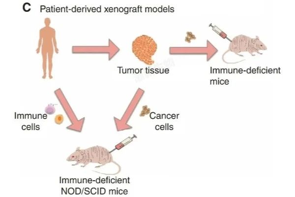 构建人源化免疫系统的PDX模型:首先将患者的肿瘤组织移植到免疫缺陷小鼠体内,待肿瘤生长后,小鼠静脉注射从患者体内分离得到的肿瘤浸润淋巴细胞(TILs)、外周血单核细胞(PBMCs)或CD34+造血干细胞(HSC),再补充特定细胞因子,将这些细胞诱导分化为T细胞、B细胞、NK细胞和巨噬细胞等,在小鼠体内重建人源化的免疫系统。