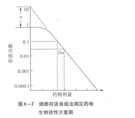 以集落存活分数的对数与剂量作图可以得到细胞存活曲线(图6-2)。由于药物对细胞的杀伤作用一般遵循一级动力学,即一定量的药物杀死一定百分比的细胞,故存活曲线呈带肩区的斜率向下的直线。其方程为S=1-(1-e-D/Do)n。S为存活分数,D为剂量,Do是存活分数在细胞存活曲线中直线部分下降63%所需的剂量,n是曲线指数部分外延至¥轴的截距,称外推值。Do越小,敏感性越高。n反映细胞对药物引起的损伤的修复能力,n越大,表示杀死细胞所需的阈剂量越大。