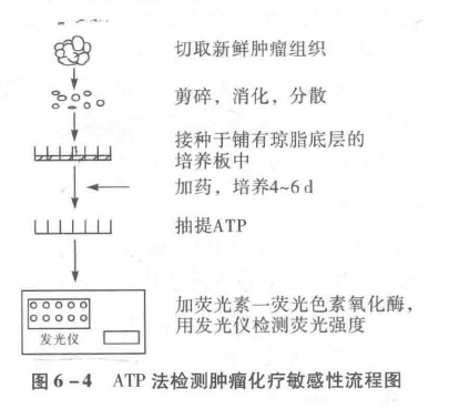 该法是一种敏感、可靠的、能测定各种细胞活力的方法(见7.1.4节)。与集落形成法,放射性同位素掺入法及染料排斥法均有良好的相关性。Perra(1987)首先将此方法用于新鲜瘤组织的药敏检测,是体现药物对全体瘤细胞群杀伤的体外药敏方法,该试验周期较短,与临床相关性较好。进行药物敏感试验时,需预先在培养板的孔底铺一层0.5%琼脂培养基以防正常细胞生长,然后接种肿瘤细胞,加药物培养一定时间,测定细胞内ATP活性。试验流程见图6-4。一组实体瘤的实验表明,其临床精确预测率为88.8%。