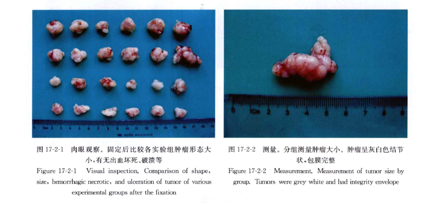 皮下接种肿瘤取材,注意观察肿瘤形状,如呈圆形、椭圆形或分叶状,表面是否光滑有无包膜形成,瘤体色泽、大小及质地,有无完整的包膜与周围组织粘连或破溃。不要损伤瘤体组织。原位移植肿瘤,如肺癌裸澈鼠原位接种,注意观察肺内肿瘤是否呈灰白色,肿瘤结节数量,有无浸润胸部纵隔器官与淋巴结转移。人胃病裸鼠原位接种模型,观察胃部肿块大小、质地,胃黏膜皱襞有无消失等,如肿瘤与周围组织粘连,就与周围组织一块取出。取出肿瘤立即固定于10%中性甲醛或4%多聚甲醛液中,固定液是组织体积的30~50倍,固定时间24~48小时,用振荡固定法更好,并详细观察记录。