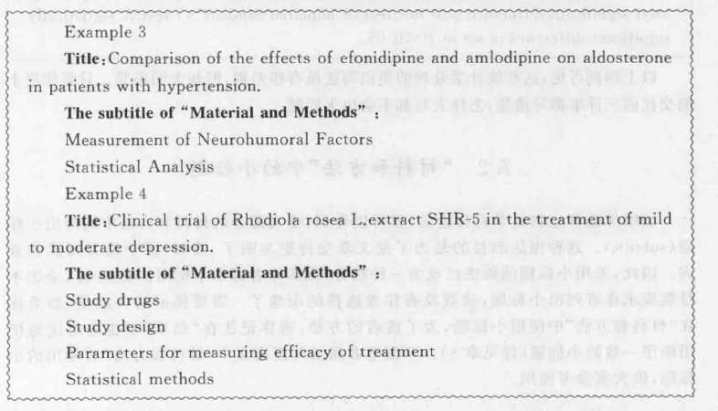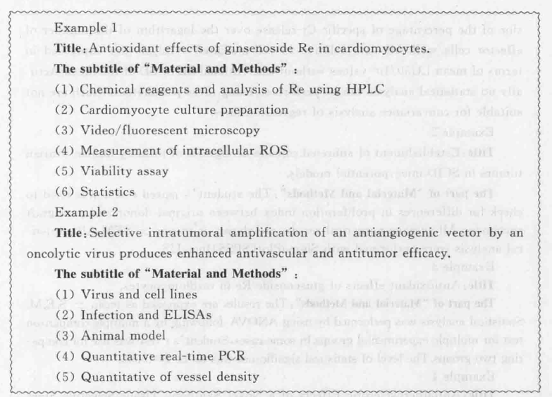 如果你翻开生物医学科技论文,就可以看到,绝大部分的材料和方法中均分出小标题(subtitle)。这种做法的目的是为了使文章变得更为明了、清晰,便于读者阅读和查询。因此,采用小标题的做法已成为一种趋势,很多作者都乐于使用。有些SCI杂志本身就要求作者列出小标题,这就没有作者选择的余地了。需要提示的一点是,如果你在“材料和方法”中使用小标题,为了读者的方便,请你记住在“结果”中也应对应地使用顺序一致的小标题(详见章8)。下面笔者摘录几篇论文中“材料和方法”所使用的小标题,供大家参考使用。