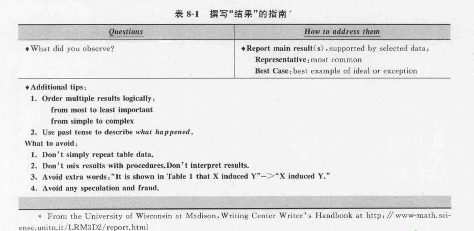 实验结果是生物医学科技论文中的根基、核心(core)和重要组成部分。Cetin和Hackam(2005)把结果比喻为论文的真正心脏和灵魂(The results section is truly theheart and soulof the manuscript)。因为这部分内容包含了支持你在文章中提出的理论或假说的全部资料。从根本上说,一篇SCI论文的水平高低取决于实验的成败及实验结果的价值。因此,“结果“在论文中起着极为重要的、不可忽视的作用,不管人们是否把它放在首位来阅读。正如表8-1所示,在实验“结果”中,你所要回答的问题只有一个,这就是“在实验中观察到什么现象”(Whatdid you observe)。由此可知,论文中撰写“结果”的目的有二。
