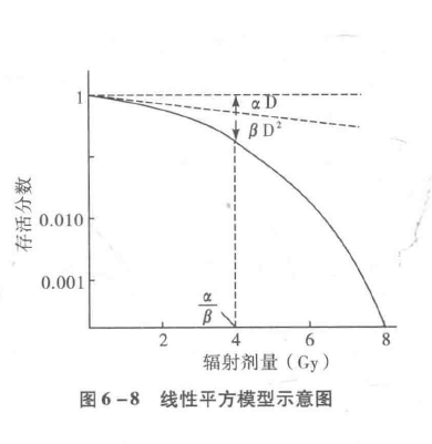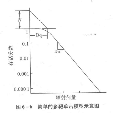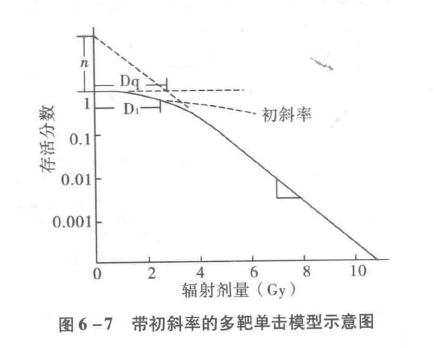 这个模型是以DNA双链断裂时造成细胞死亡的假设建立的。式中n、p分别代表一次冲击和两次冲击所造成DNA双链断裂的参数(图6-8)。