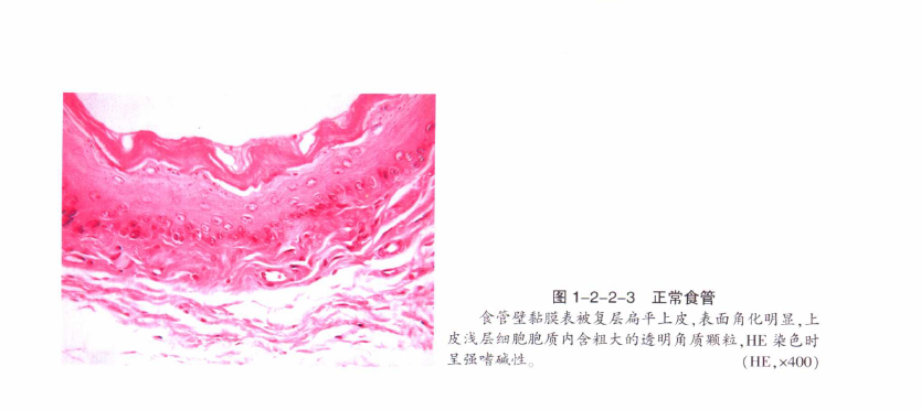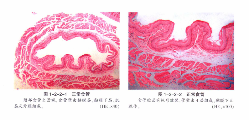 显微镜下食管壁由黏膜层(mucosa)、黏膜下层(submucosa)、肌层(muscularis)及外膜(adventi-tia)组成,食管外膜又称纤维膜(fibrosa)。黏膜上皮为复层扁平上皮(stratified squamous epitheli-um),表面有中度到高度角化,固有层致密,主要由纤维结缔组织组成。黏膜下层为疏松结缔组织,内无腺体。肌层由内环形、外纵形两层肌纤维组成,以横纹肌为主体。